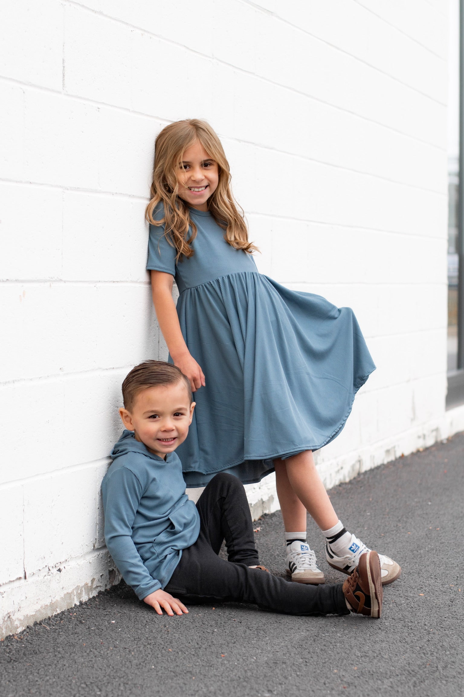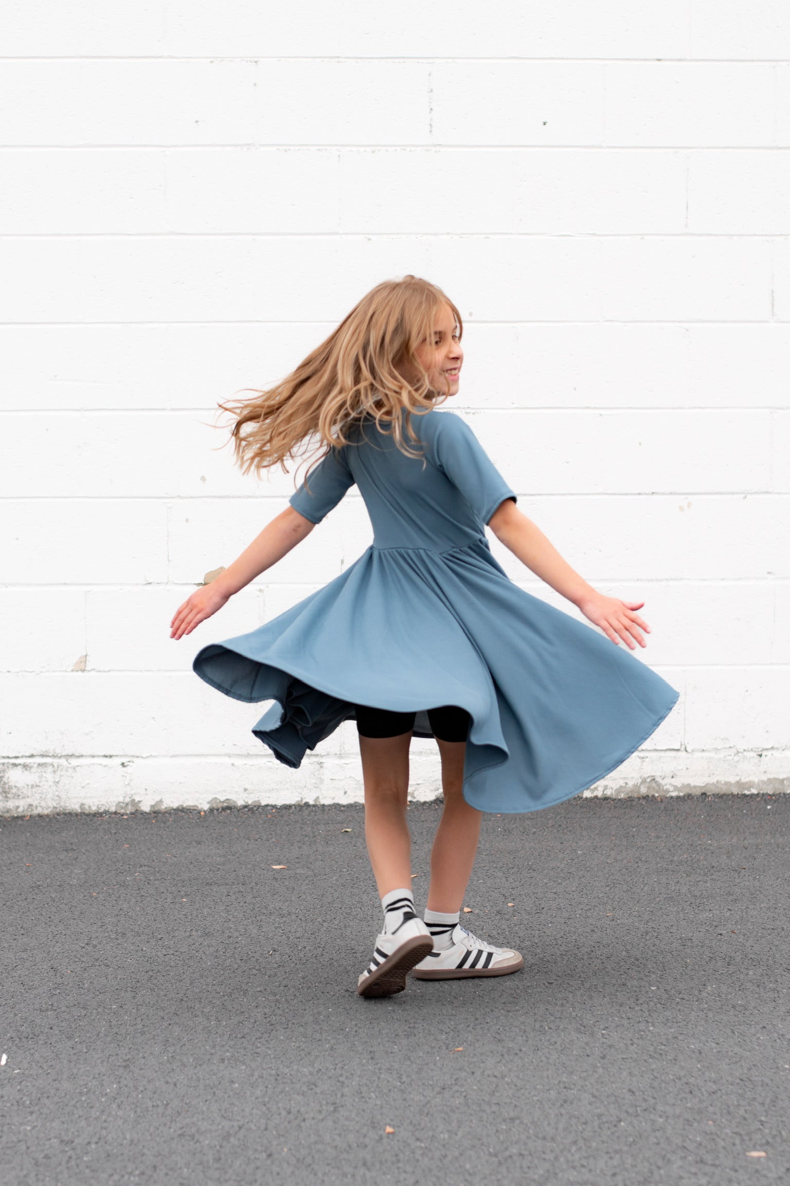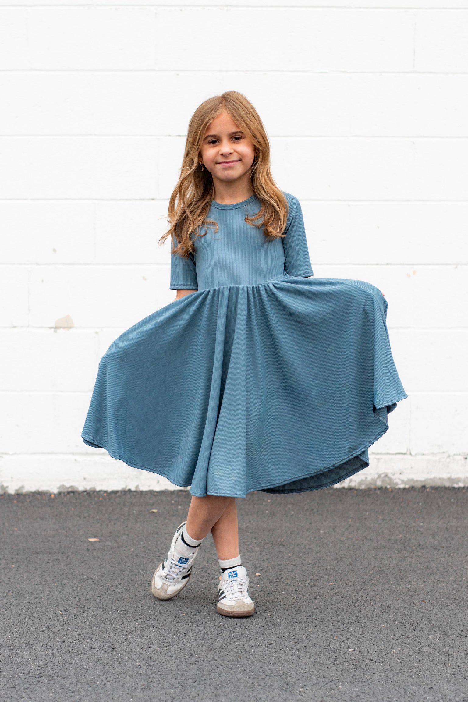 MID SLEEVE TWIRL DRESS- Slate Micro Rib